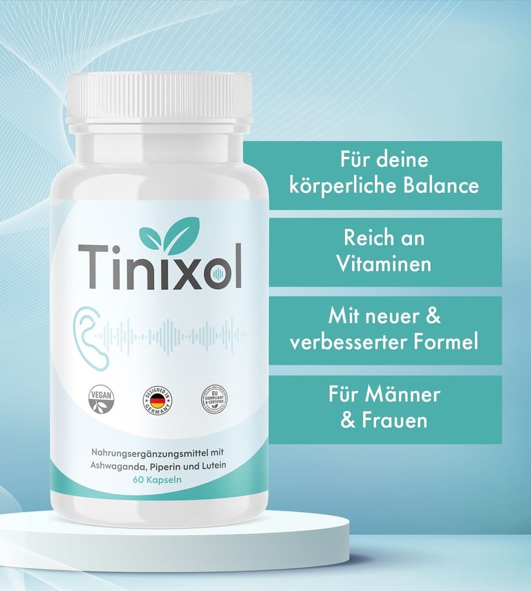 Wichtiger Hinweis: Dieser Inhalt dient ausschließlich Informations- und Werbezwecken. Nahrungsergänzungsmittel sind kein Ersatz für eine ausgewogene Ernährung oder medizinische Behandlung. Vor der Einnahme von Tinixol oder jedem anderen Ergänzungsmittel sollten Sie unbedingt Ihren Arzt oder Apotheker konsultieren – insbesondere bei bestehenden Erkrankungen, regelmäßiger Medikamenteneinnahme, Schwangerschaft oder Stillzeit. Die getroffenen Aussagen wurden nicht von einer amtlichen Behörde (wie z. B. dem Bundesamt für Verbraucherschutz und Lebensmittelsicherheit oder der Europäischen Behörde für Lebensmittelsicherheit) geprüft oder bewertet. Die Produkte sind nicht dazu gedacht, Krankheiten zu diagnostizieren, zu behandeln, zu heilen oder vorzubeugen. Individuelle Ergebnisse können stark variieren. Bei gesundheitlichen Beschwerden wie Tinnitus immer einen Facharzt (z. B. HNO-Arzt) aufsuchen.